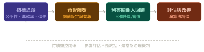 AI 系統在部署後會持續演化——使用者行為改變、資料分布漂移、社會脈絡轉變,都可能讓原本通過評估的系統在幾個月後產生完全不同的影響。這意味著影響評估不能是一次性活動,而必須成為持續的治理機制。