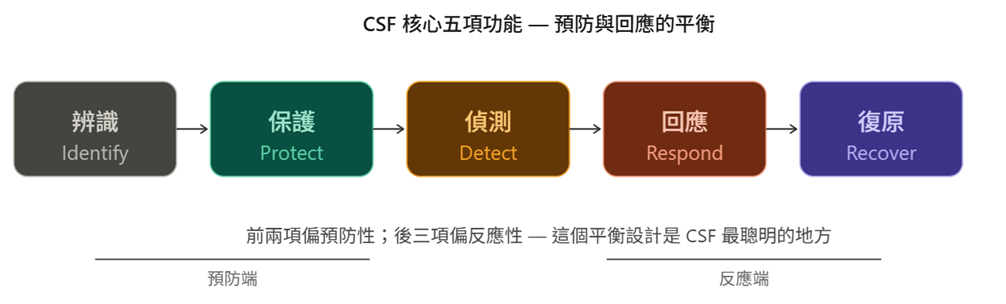 辨識、保護、偵測、回應、復原——這五個字看起來很普通,但它們有個巧妙之處:前兩個功能是預防性的,後三個是反應性的。這個「領結型」的平衡設計,讓 CSF 既能作為風險管理策略的高階框架,也能對應到具體的事件處理流程。更重要的是,這五個功能用的是非技術人員也能理解的語言,讓 CISO 終於有辦法跟董事會說得清楚。