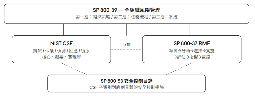 簡單說:SP 800-39 是最頂層的哲學,定義了風險管理的三個組織層級;CSF 提供了語言和結構,讓各層級的人能夠溝通;RMF(SP 800-37)是把安全要求落地到具體資訊系統的操作流程;SP 800-53 則是最底層的控制措施清單。這四者環環相扣,缺一不可,但很多組織只用其中一個,然後困惑為什麼整個資安計畫感覺「飄在空中」。