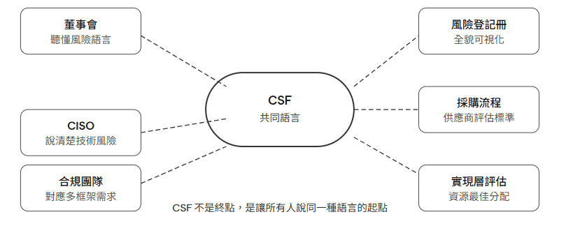 值得一提的是,NIST 在 2024 年初正式發布了 CSF 2.0,在原本五個功能之外新增了第六個:「治理(Govern)」。這個新增的功能,直接呼應了近年來全球監管機構把網路安全治理納入董事會責任的大趨勢。