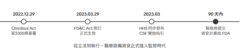 2022 年底,美國國會悄悄在一份龐大的綜合撥款法案(Omnibus Act)裡,塞進了一個對醫療設備產業影響深遠的條款——第 3305 條,正式修訂了《聯邦食品、藥物及化妝品法》(FD&C Act),要求所有未來上市的醫療設備必須在設計階段就內建網路安全保護。