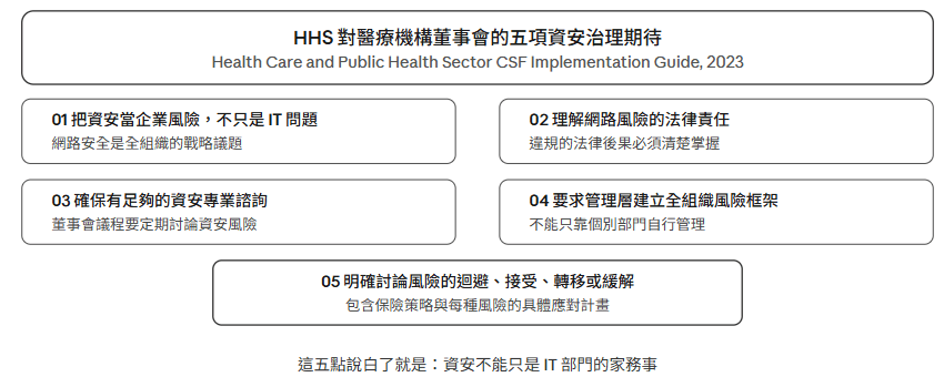 與法規同步發布的,還有美國衛生部(HHS)針對醫療機構的 NIST CSF 實施指引。彼得覺得這份指引裡最有價值的部分,是它對董事會的五項具體期待。